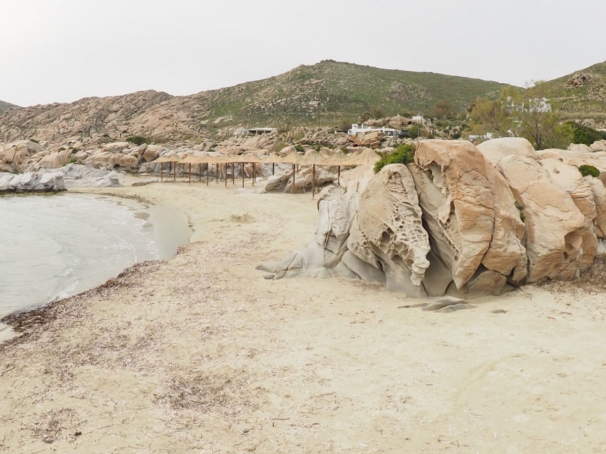 Ψηλές αροκαριές διακόπτουν πότε πότε, τη χαμηλή κυκλαδίτικη βλάστηση. Κρεμασμένα ψάρια που λιάζονται στην άκρη του κύματος, δίπλα σε τρία τραπέζια που σε καλούν να τα καθίσεις, πείθουν την όρεξή μας να τα γευτούμε...