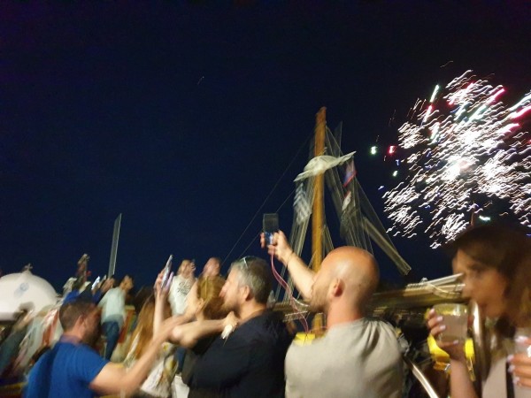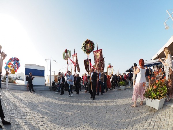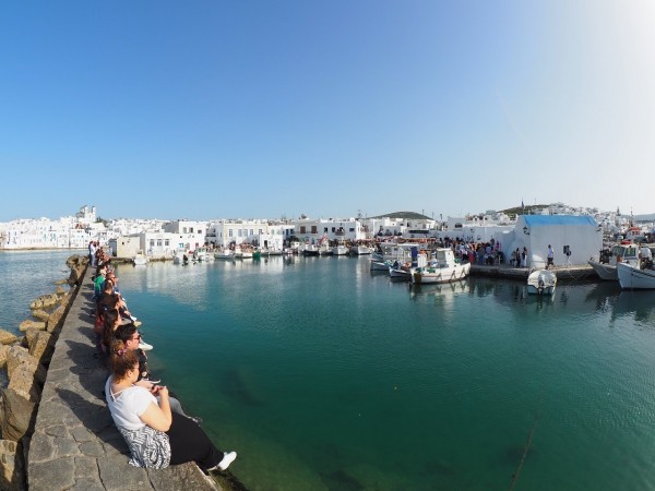 Στο λιμανάκι της Νάουσας, πάτα με να σε πατώ, ακόμα και πάνω στα καΐκια. Για τραπέζι ούτε λόγος... Διασκεδάζουμε με τα τραγούδια και λίγο πιο δίπλα πίνουμε καφέ στης Σοφίας. Προσκυνούμε την εικόνα της Αγάπης του Χριστού, που περιφερόμενη σταματά για λίγο τον χαμό.